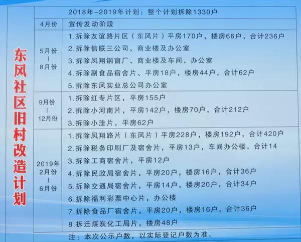 东风社区7片,加8家企事业单位,共计1330户,居民、单位、办公及车间均在拆迁范围之中。