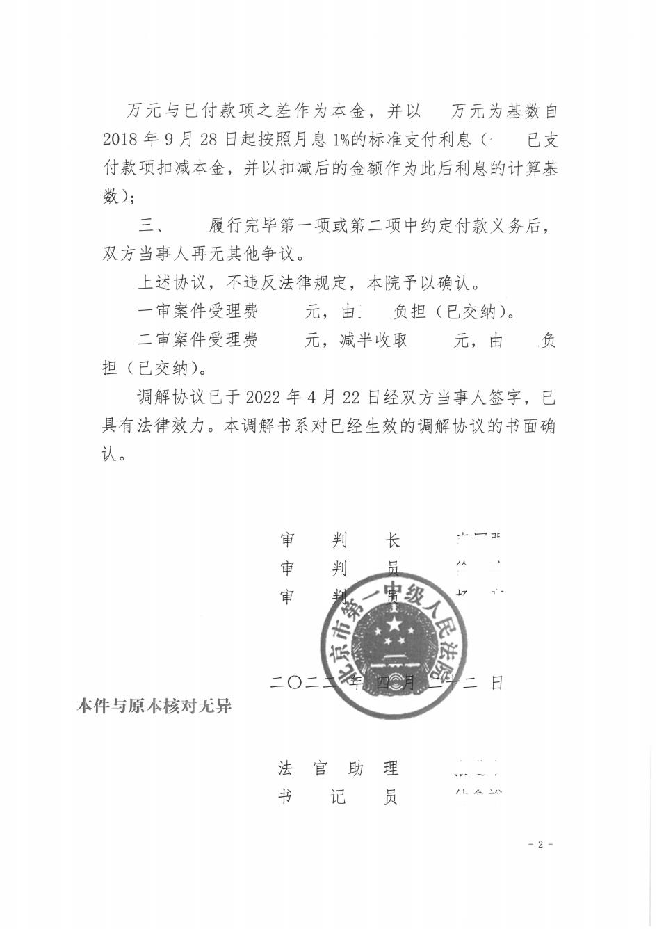 2022年3月17日,本所李亚杰律师接受北京市石景山区王先生的委托,代理其民间借贷纠纷上诉一案。2022年4月22日,李律师在北京市第一中级人民法院参加了本案谈话程序,促成本案当庭达成令王先生满意的调解协议。当天,北京市第一中级人员法院出具生效的《民事调解书》,对调解协议的内容进行司法确认。委托人的诉讼请求得到支持,合法权益得以维护!